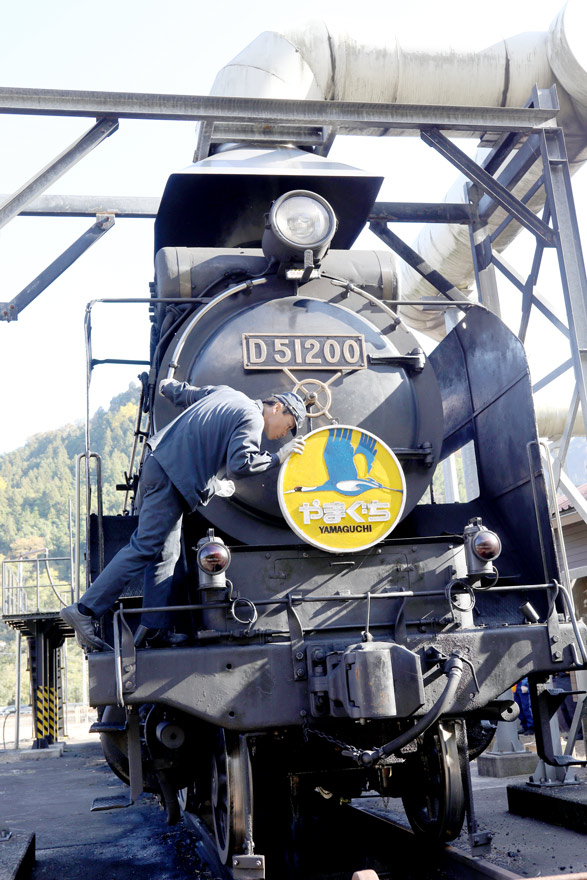 〔 D51形200号機、ピットで ” やまぐち号ヘッドマーク ” の点検も入念に! 〕