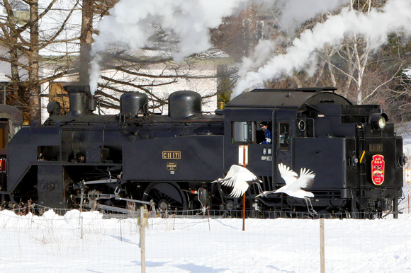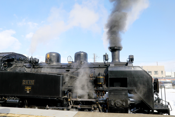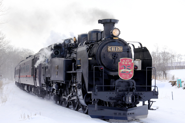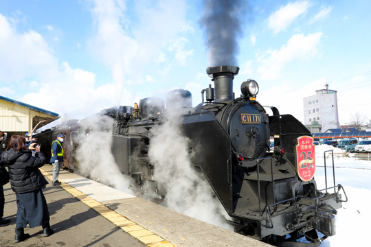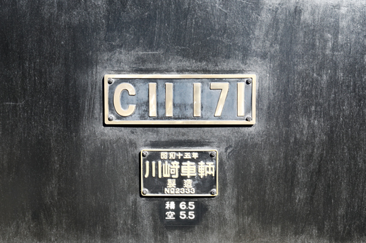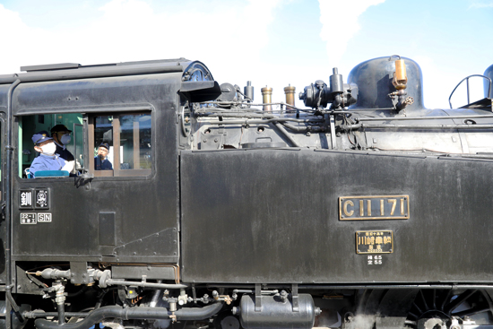 5両編成の客車をけん引するのは、国鉄C11形蒸気機関車171号機。1940年の製造以降、長い歴史を