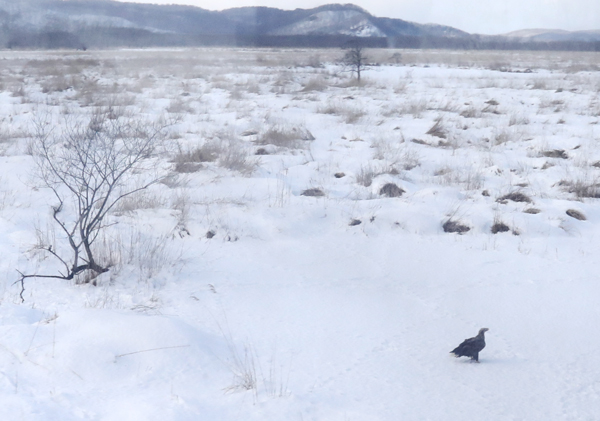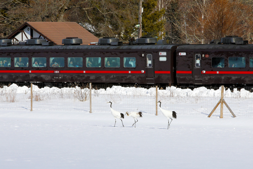 釧路湿原の大パノラマが広がる車窓からは、雪原に舞うタンチョウやエゾシカなどの野生動物の姿が