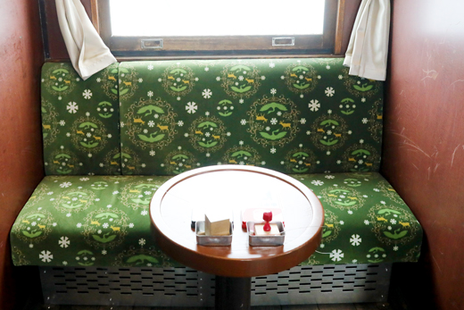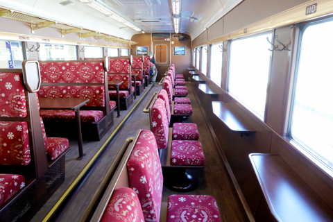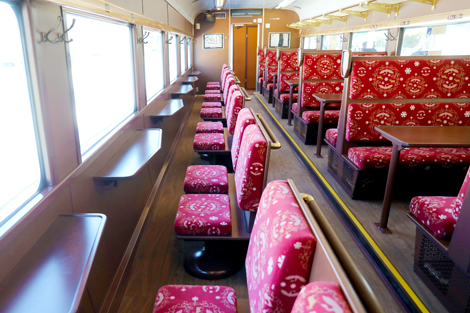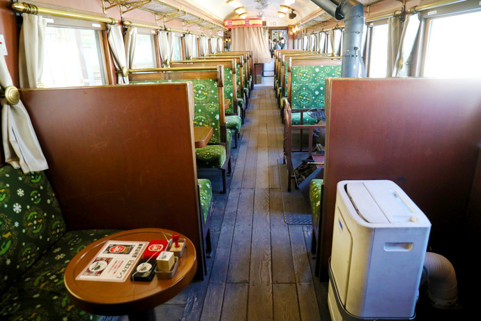車内はニス塗りの重厚な壁、木枠のイスなど、徹底して「本物のレトロ」にこだわっています。