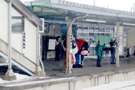 ホーム側の駅舎入口前に歓迎文字が!